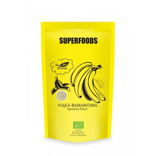 Поживне бананове борошно від Bio Planet виготовлено з платанів, тобто овочевих бананів, також відомих як зелені банани. Попри зовнішній вигляд, він не солодкий, але нейтральний на смак, тому підходить для приготування як солоних страв, так і солодкої випічки. Особливо рекомендується для людей, які уникають зернових та продуктів, що містять глютен, у своєму раціоні, оскільки він не містить глютену.
