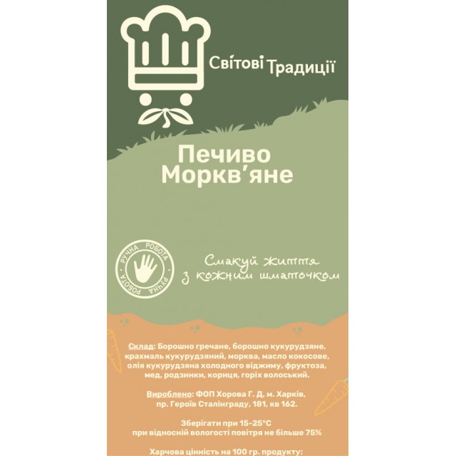 В основі нашого печива — унікальне поєднання гречаного та кукурудзяного борошна, що надає йому особливої текстури та робить його безглютеновим. Соковита морква не лише додає природної солодкості, а й збагачує печиво вітамінами.