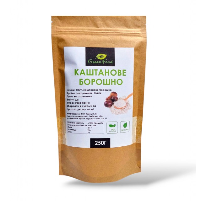 Каштановая мука - это натуральная безглютеновая и легкоусвояемая мука. Оно не содержит никаких добавок, и содержит только съедобные каштаны. Мука характеризуется нежним, сладким вкусом. Мука каштановая богатая в крахмал, и в то же время содержит небольшое количество жира. В каштановой муки есть еще одна интересная особенность, а именно она содержит сахар, который медленно поглинаеться нашим организмом. Поэтому, в частности, продукты на основе каштановой муки должни быть интересны для физически активных людей и людей, и которые много работают умственно.