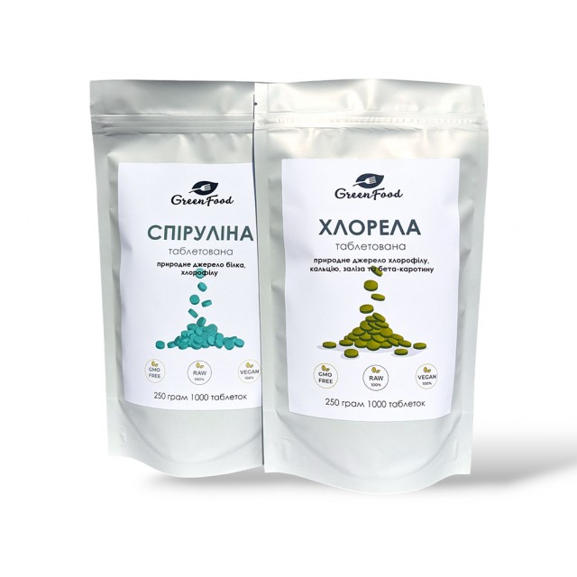 Відкрийте для себе потужну синергію двох найвідоміших суперфудів в одному наборі від TM GreenFood. Комплект, що містить по 1000 таблеток (250 грамів) спіруліни та хлорели, створений для повноцінної підтримки вашого організму, забезпечуючи його всім необхідним для здоров’я та життєвої енергії.